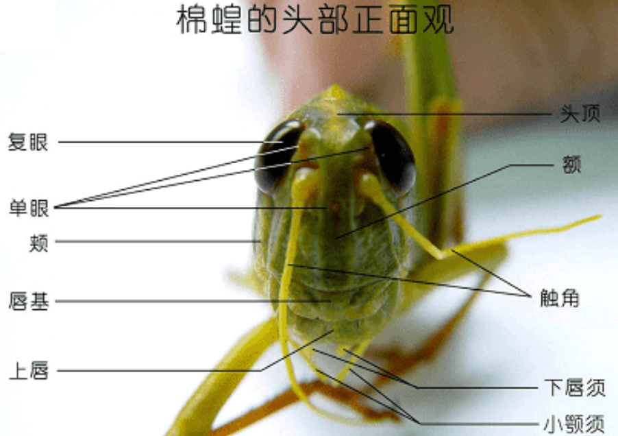 是蝗虫的取食器官。蝗虫的口器由5部分组成,包括上唇、下唇各1片,上颚、下颚各2片,舌1片。上颚十分坚硬,适于咀嚼,是切断、嚼碎植物茎叶的主要结构。