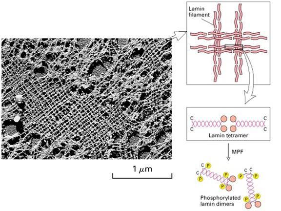 - 核纤层蛋白 B 在分裂期与核膜小泡结合,引导核膜围绕染色体重新组装。