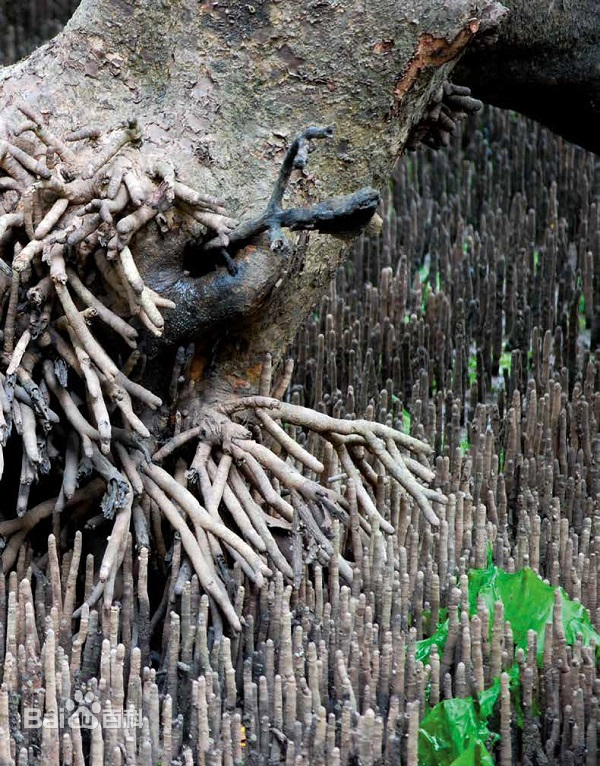 生长在我国南方海岸的红树、木榄、白骨壤,河岸、池边的水松都有许多支根,从淤泥中或水面下向上生长,挺立在空气中。呼吸根外有呼吸孔,内部有薄的皮层和发达的通气组织,以利于通气和贮藏气体,维持植物的正常生长。 [3]