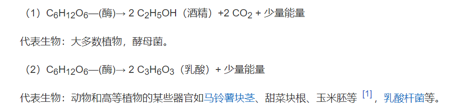 细胞在无氧条件下,通过酶的催化作用,把葡萄糖等有机物分解为不彻底的氧化产物,同时释放出少量能量的过程。