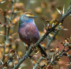 花彩雀莺是一种体型娇小的鸟类,体长9-12厘米,体重6-8克。全身羽毛松软且毛茸茸,偏紫色。具体特征如下: