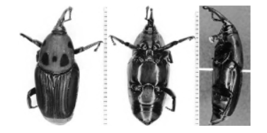 - 成虫:体长19.0~35.0毫米,红褐色至暗褐色,具光泽。头部延伸成喙状,雄虫喙粗短且直,喙背具一丛毛;雌虫喙细长而弯曲,喙与头部长度约为体长的1/3。前胸背板椭圆形,通常具两排黑斑(前排3~5个,后排2~3个,个体间存在变异)。鞘翅红褐色或暗黑褐色,短于腹部,腹末外露。足部基节、转节、腿节末端及胫节末端为黑色,跗节黑褐色。