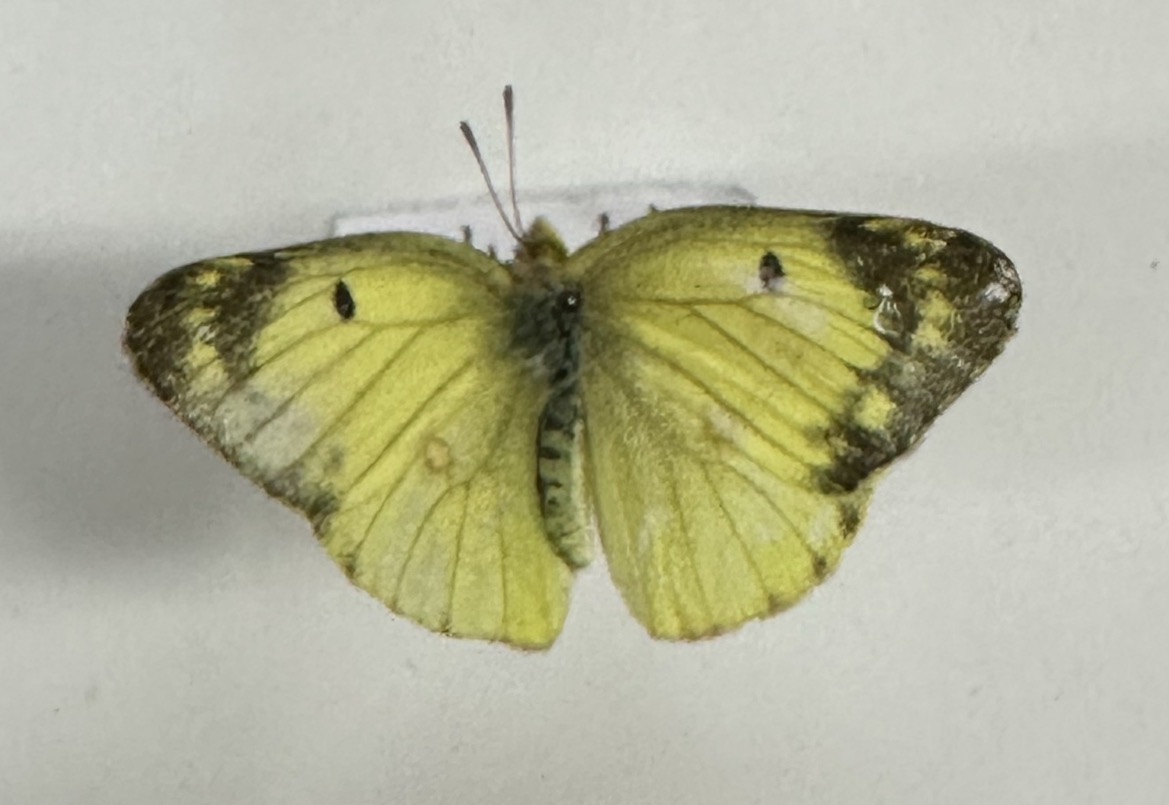 豆粉蝶成虫呈现显著的雌雄二型性(sexual dimorphism),翅展幅度在40-53mm之间。雄蝶翅面底色为鲜明的硫磺黄色,翅脉与底色同色;雌蝶则呈灰白色或淡黄绿色,整体色调更为素雅13。前翅结构上,顶角和外缘形成宽阔的黑色带纹,黑带中嵌有系列浅色斑:雄蝶为黄色斑,雌蝶为白色斑。这一特征的关键鉴定点在于:黑带在翅后缘区域明显变窄,导致该区域的浅色斑未被完全包围在黑带内——这是区分豆粉蝶与近缘种斑缘豆粉蝶(Colias erate)的核心形态学依据。