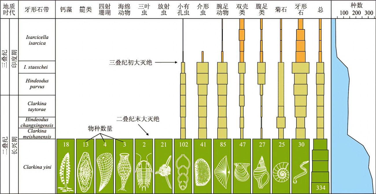 二叠纪末生了有史以来最严重的大灭绝事件,估计地球上有96%的物种灭绝,其中90%的海洋生物和70%的陆地脊椎动物灭绝,。三叶虫、海蝎以及重要珊瑚类群全部消失。陆栖的单弓类群动物和许多爬行类群也灭绝了。这